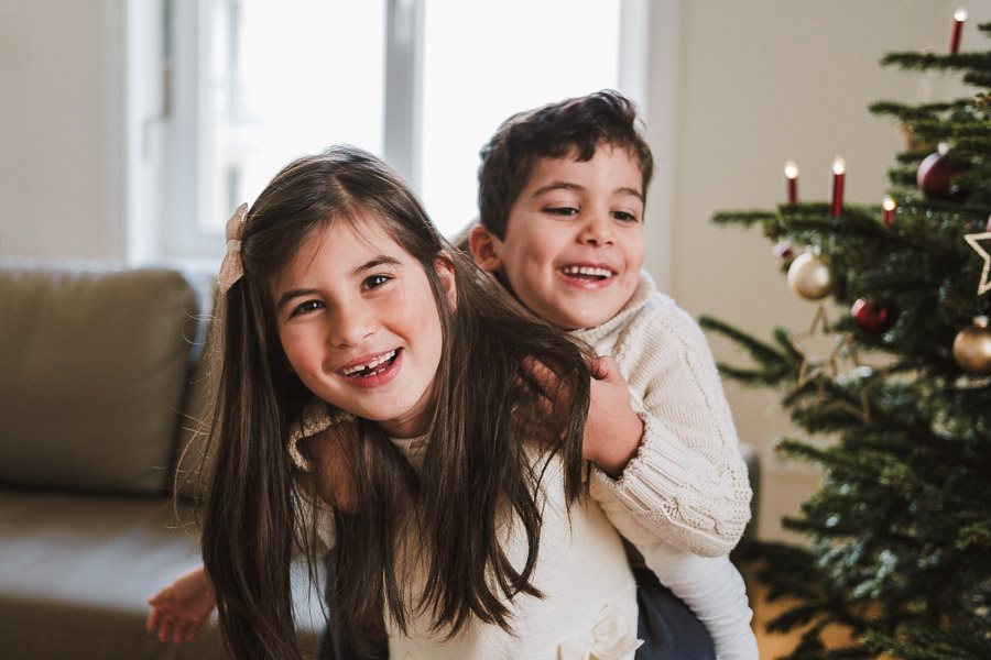 Bei diesem Weihnachts-Familienshooting entstand die erste Hälfte der Fotos in der hellen, freundlichen Altbau-Wohnung der Familie in Frankfurt. Der Weihnachtsbaum funkelte im Hintergrund, während die Kinder auf dem Sofa spielten, kuschelten und herumalberten – ganz so, wie Kinder eben sind.